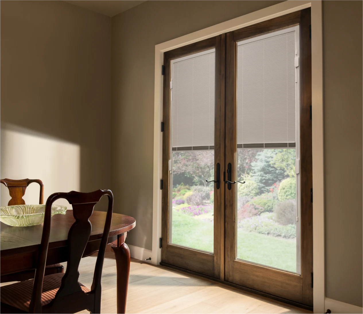 For seamless light and privacy control, you can opt to have blinds or shades installed directly between the glass panels. This integrated solution keeps the treatments protected from dust and damage while allowing you to easily manage light without interfering with the door's operation.